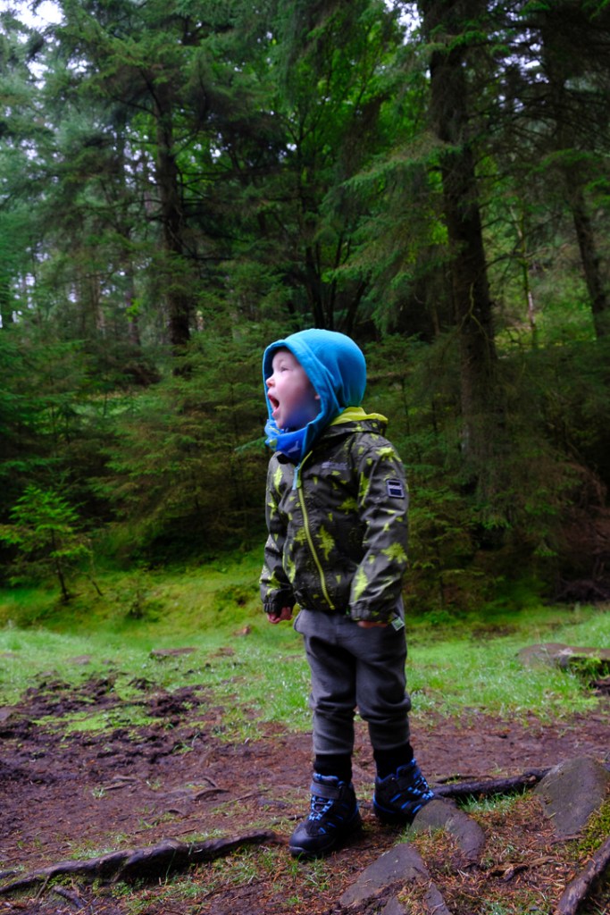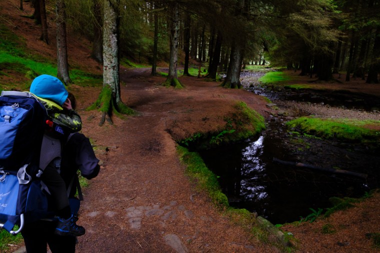 It’s located on Snake Pass, which in itself is a scenic drive and offers a good view of the hills. There’s a relatively small carpark located at the entrance to the woods (Google map link), which once across the road the path drops down fairly steeply through the trees. The path down is stepped with stone at it’s steep points, so easy underfoot if you’re wearing a kid carrier, but this is definitely not pushchair friendly.